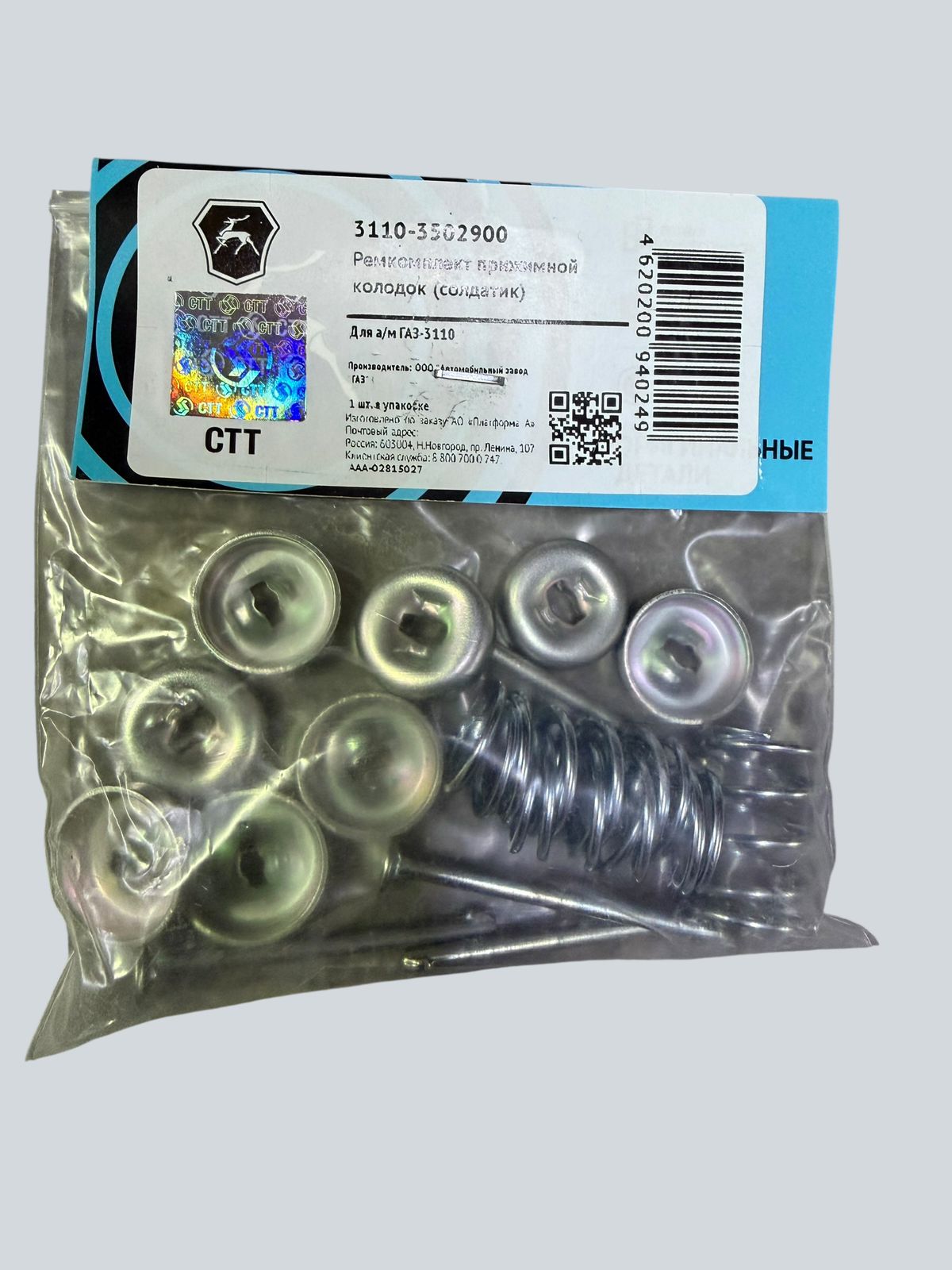 3110‑3502900 ремкомплект (солдатики) тормозных колодок — это ремонтный комплект крепёжных элементов (солдатики с пружинками) для задних тормозных колодок автомобилей ГАЗ Волга и аналогичных моделей. Артикул 3110‑3502900 используется для фиксации колодок в барабанном тормозном механизме